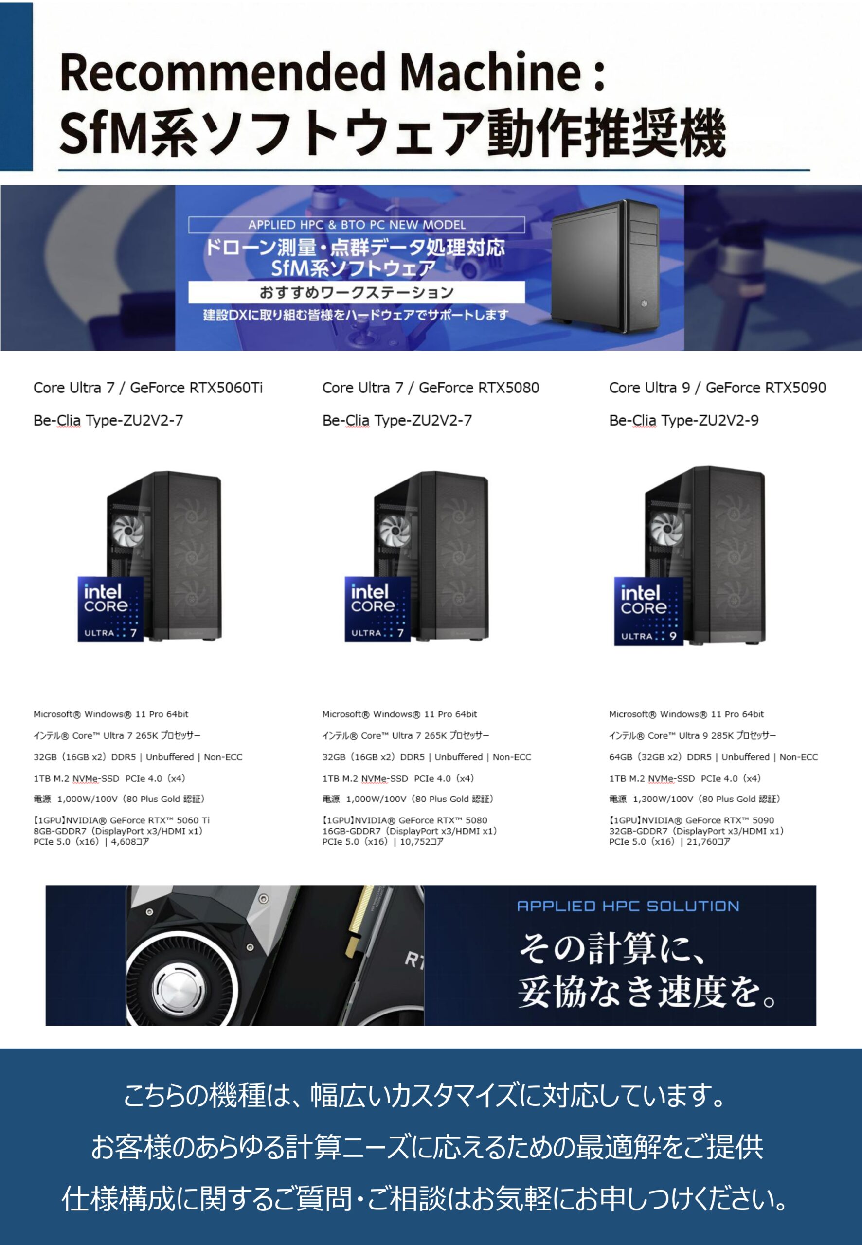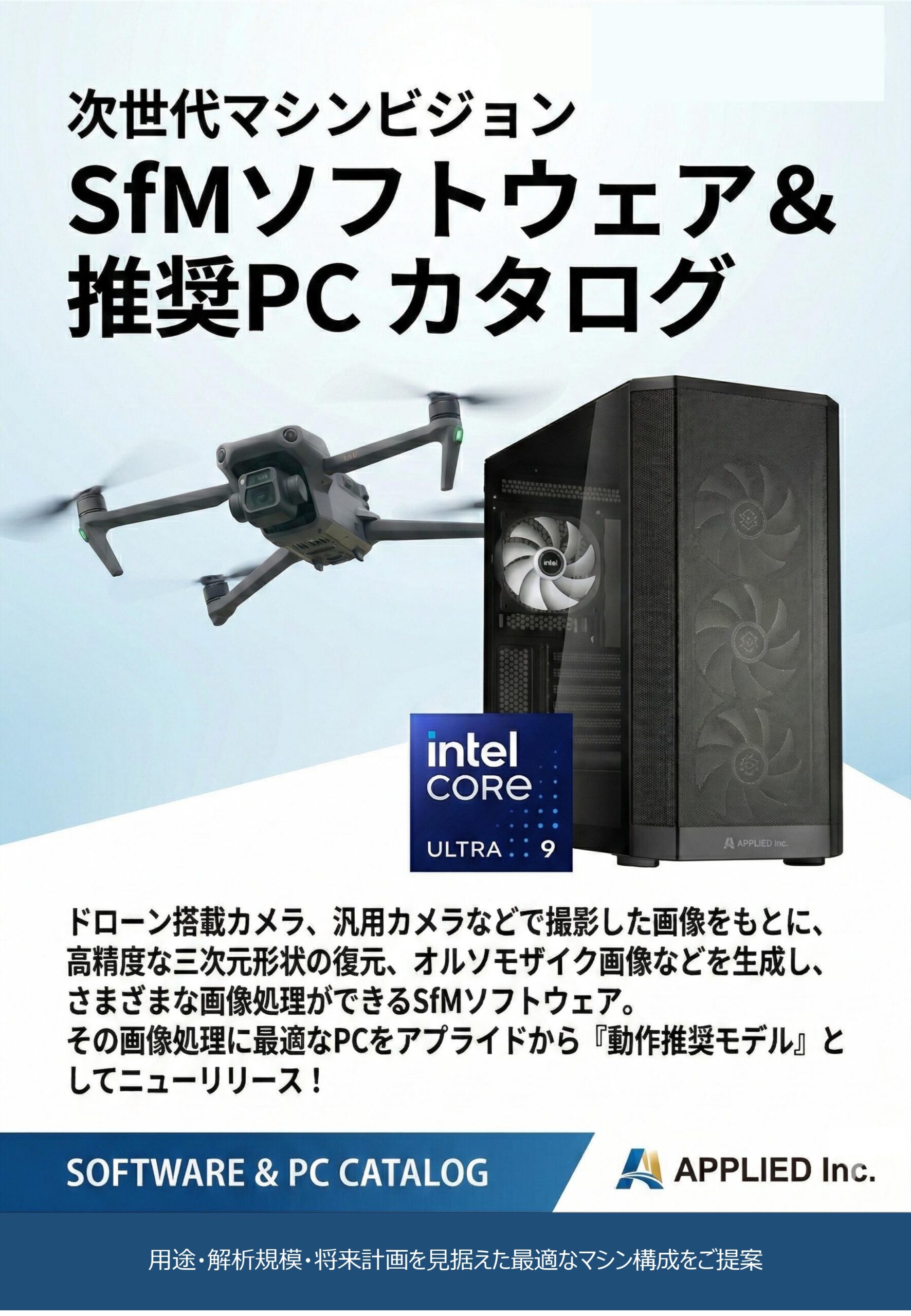 ドローン搭載カメラ、汎用カメラやマルチスペクトラムカメラなどで撮影した画像をもとに、高精度な三次元形状の復元、オルソモザイク画像などを生成し、さまざまな画像処理ができるSfMソフトウェア。その画像処理に最適なPCをアプライドから「動作推奨モデル」としてニューリリース!