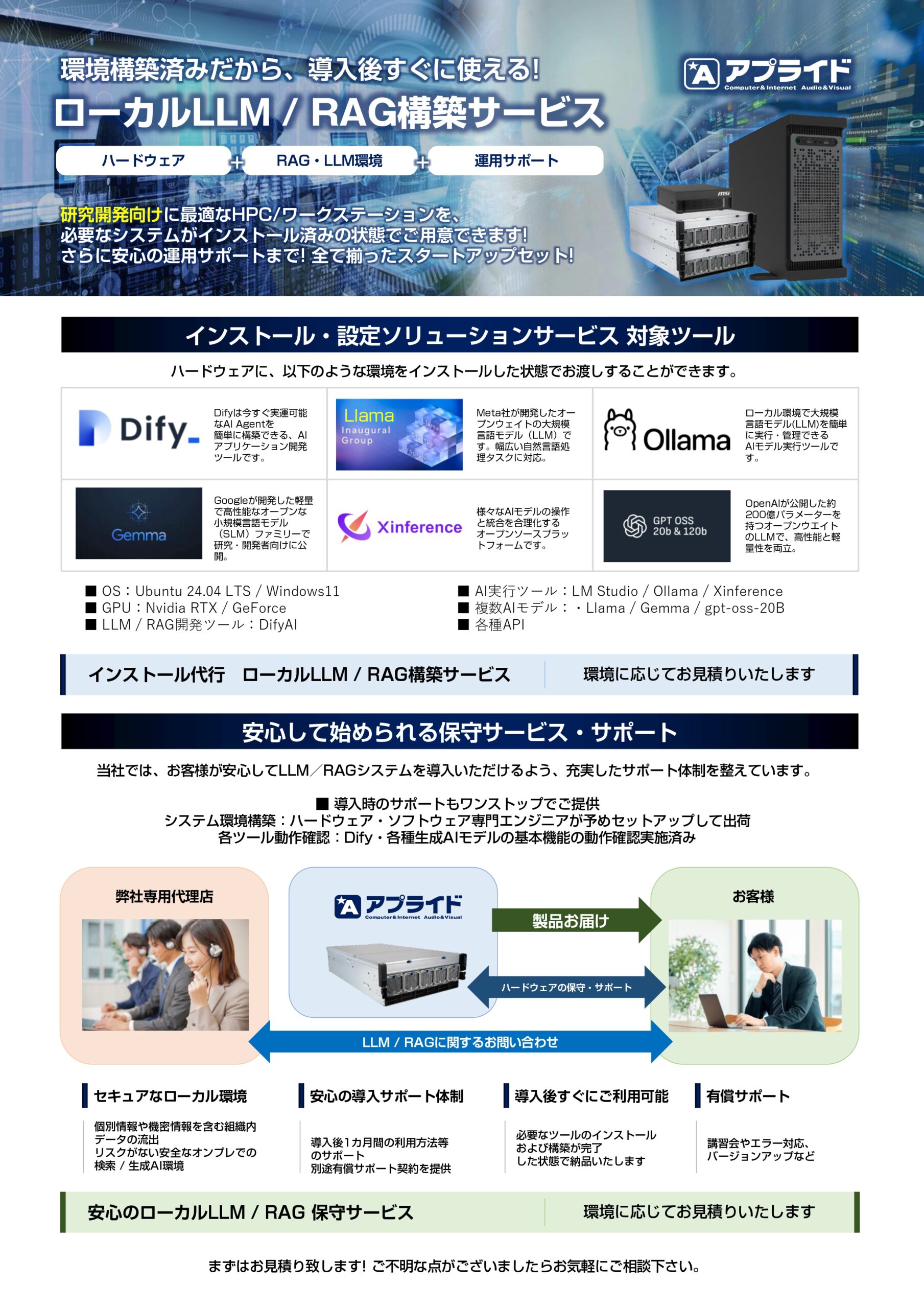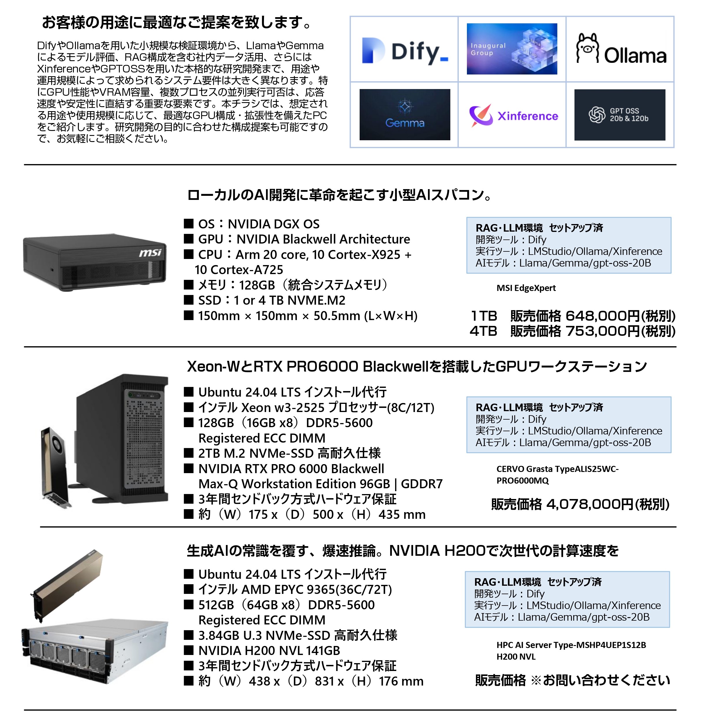 DifyやOllamaを用いた小規模な検証環境から、LlamaやGemmaによるモデル評価、RAG構成を含む社内データ活用、さらにはXinferenceやGPTOSSを用いた本格的な研究開発まで、用途や運用規模によって求められるシステム要件は大きく異なります。特にGPU性能VRAM容量、複数プロセスの並列実行可否は、応答速度や安定性に直結する重要な要素です。本チラシでは、想定される用途や使用規模に応じて、最適なGPU構成・拡張性を備えたPCをご紹介します。研究開発の目的に合わせた構成提案も可能ですの