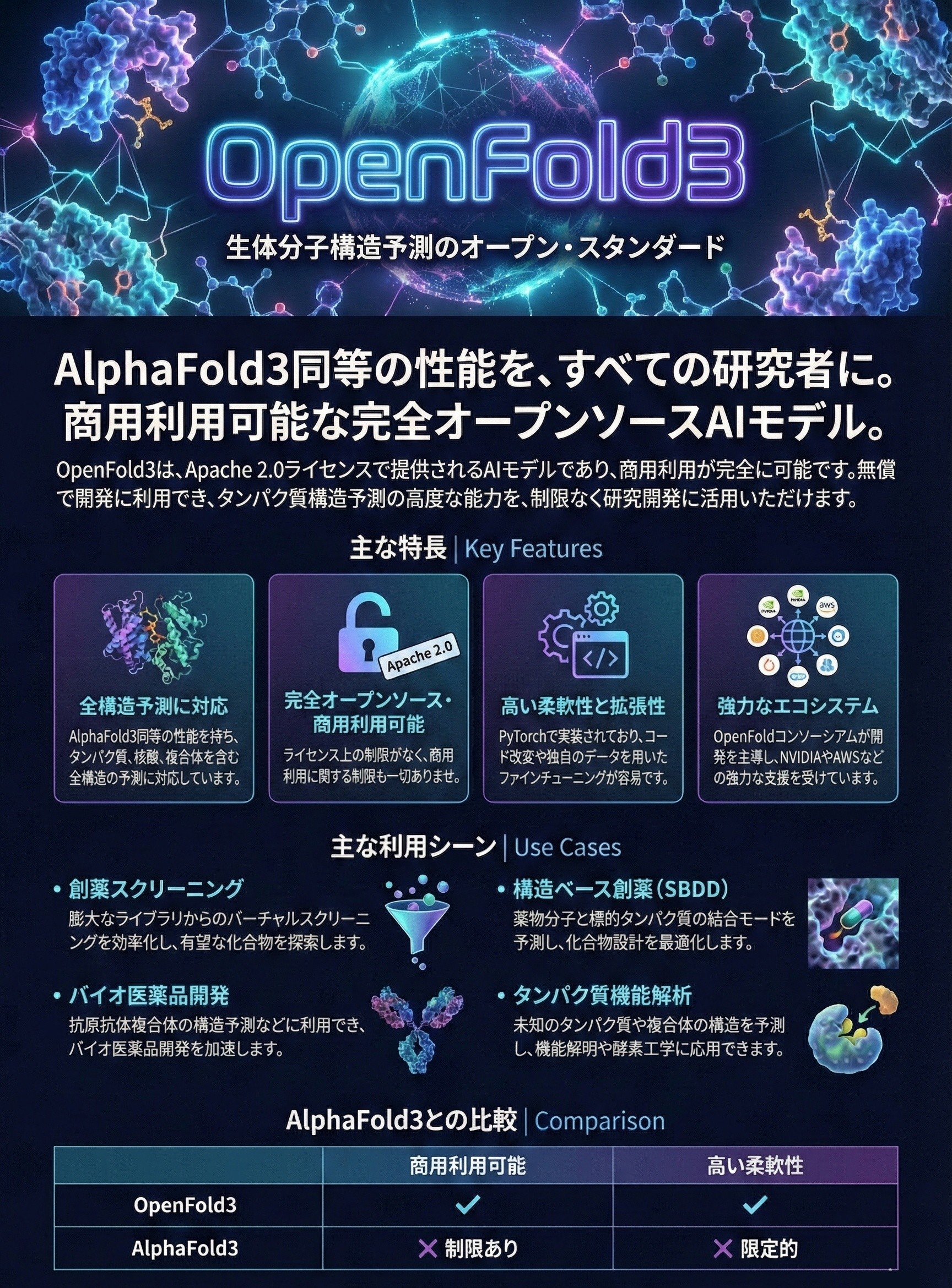 openfold 3は、タンパク質だけでなく、DNA、RNA、リガンドなどの複雑な分子の構造と相互作用を高精度に予測する完全オープンソースのAIモデルです。医薬品開発やゲノム研究など、生命科学全般の研究を加速させています。