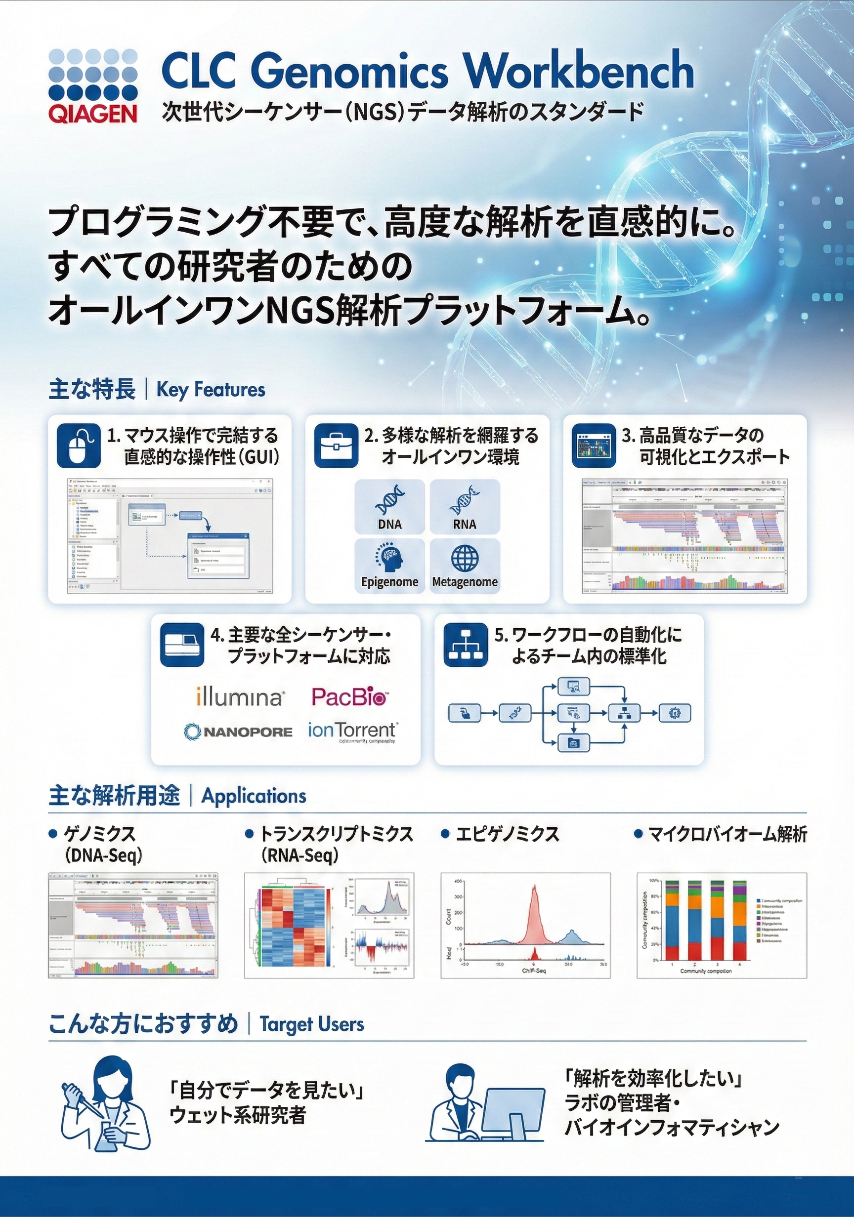 ■オールインワンの解析環境: DNAシーケンス、RNAシーケンス、エピゲノム、メタゲノムなど、多様なアプリケーションに対応するツールが1つのパッケージに統合されています。