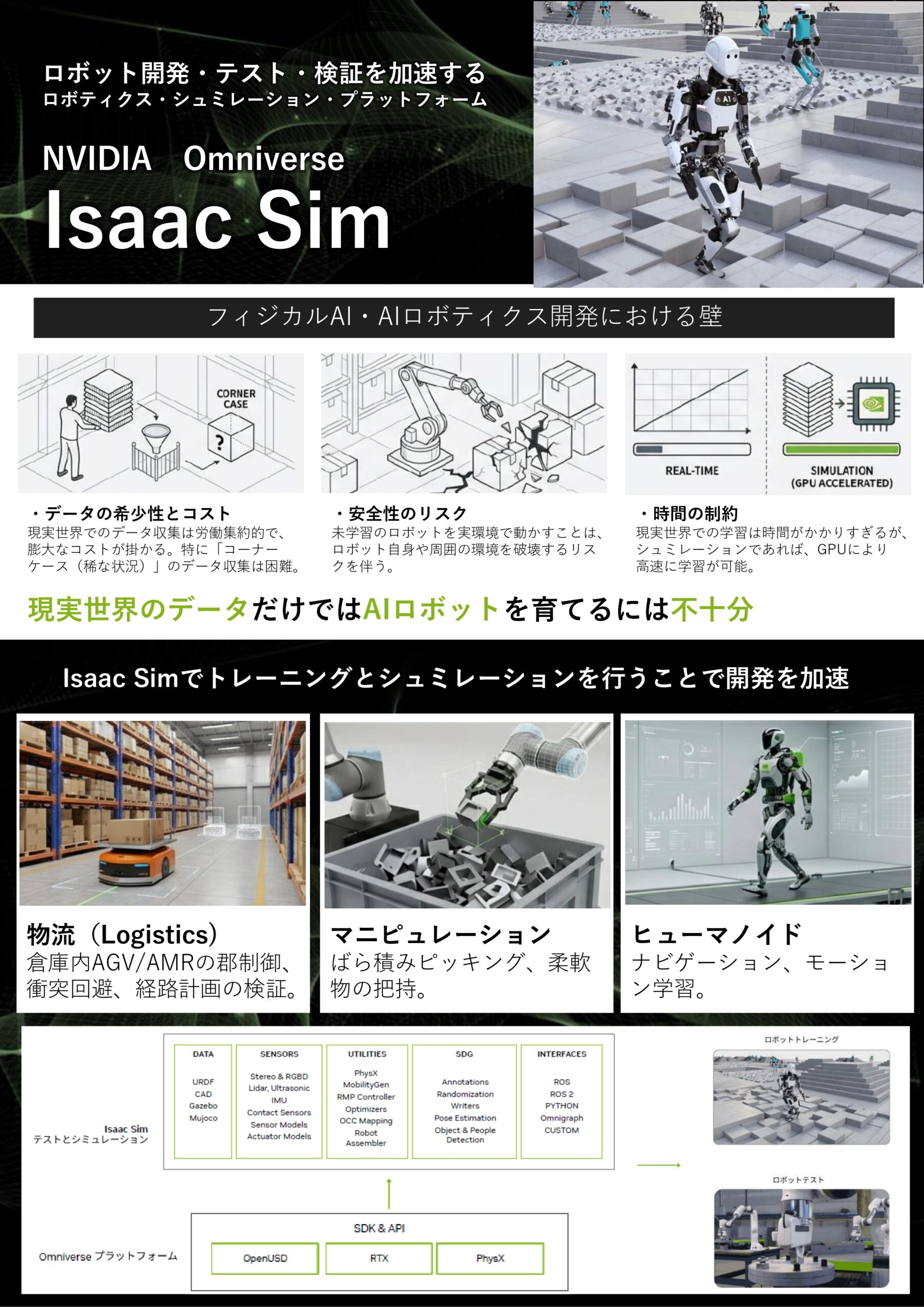 NVIDIA Isaac Simは、製造、物流、ヒューマノイド開発など、多岐にわたる分野で「シミュレーション・ファースト(実機を動かす前に仮想空間で徹底的に訓練する)」の手法を実現するために活用されています。