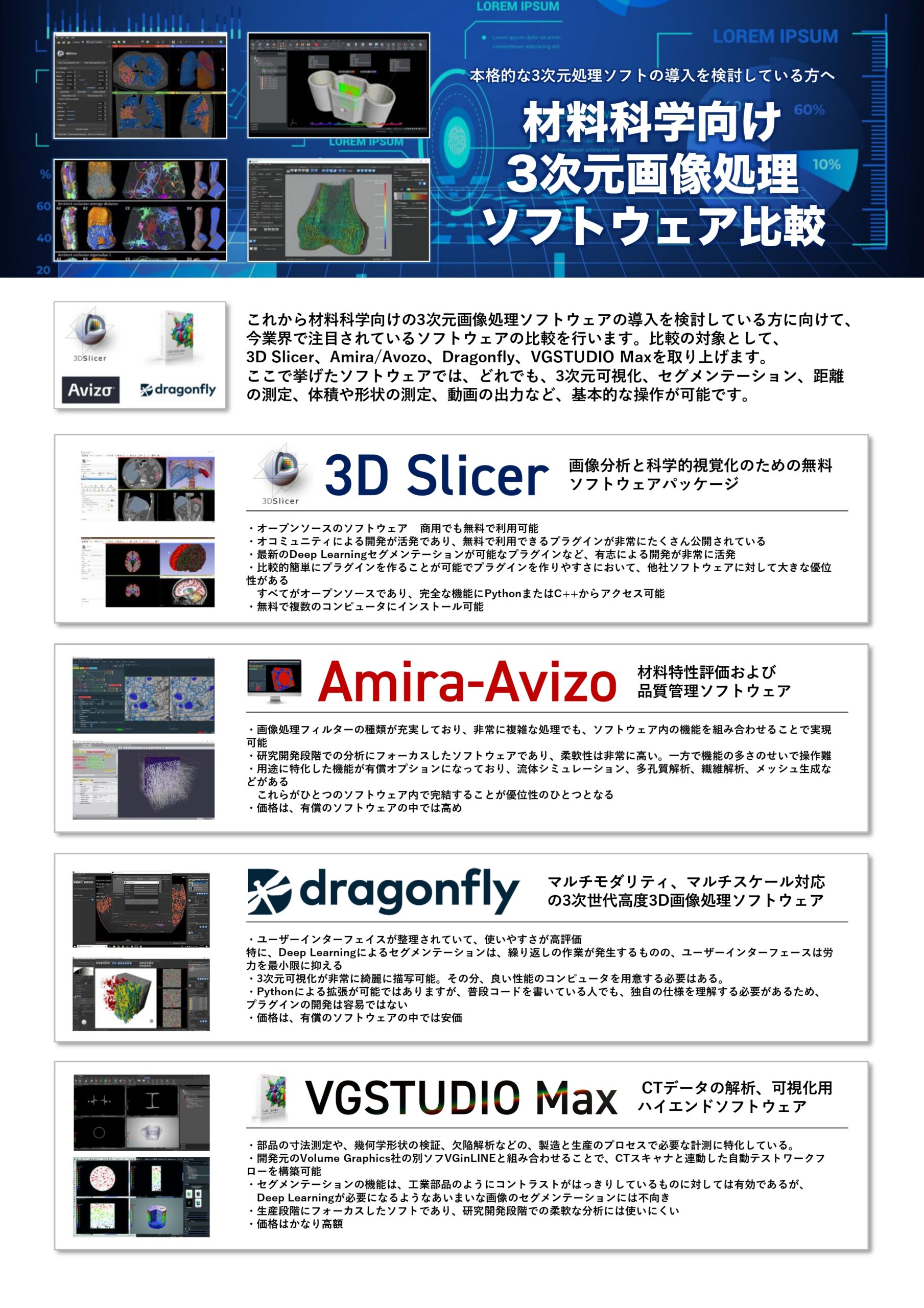 これから材料科学向けの3次元画像処理ソフトウェアの導入を検討している方に向けて、今業界で注目されているソフトウェアの比較を行います。比較の対象として、3D Slicer、Amira/Avozo、Dragonfly、VGSTUDIO Maxを取り上げます。