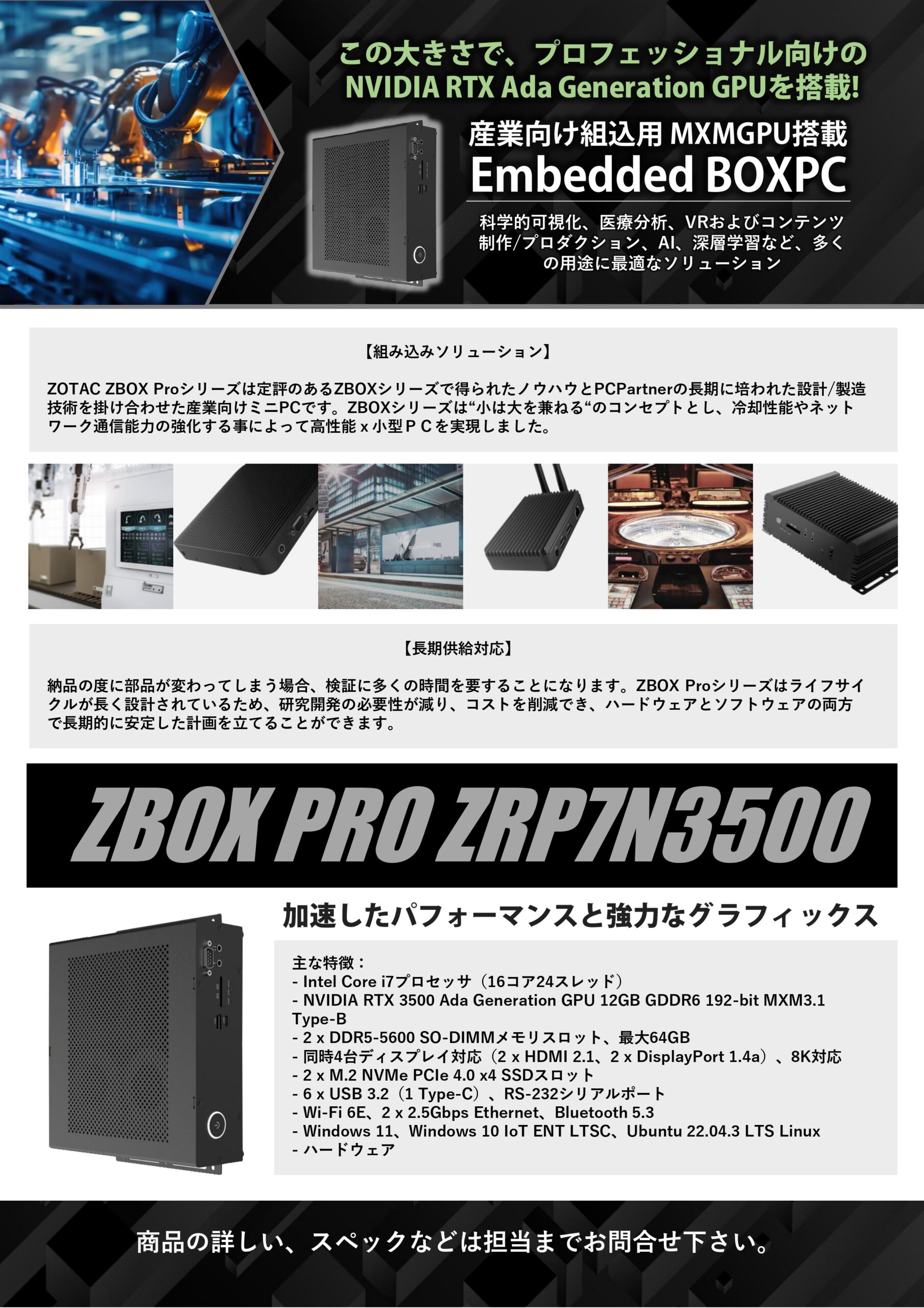 ZOTAC ZBOX Proシリーズは定評のあるZBOXシリーズで得られたノウハウとPCPartnerの長期に培われた設計/製造技術を掛け合わせた産業向けミニPCです。