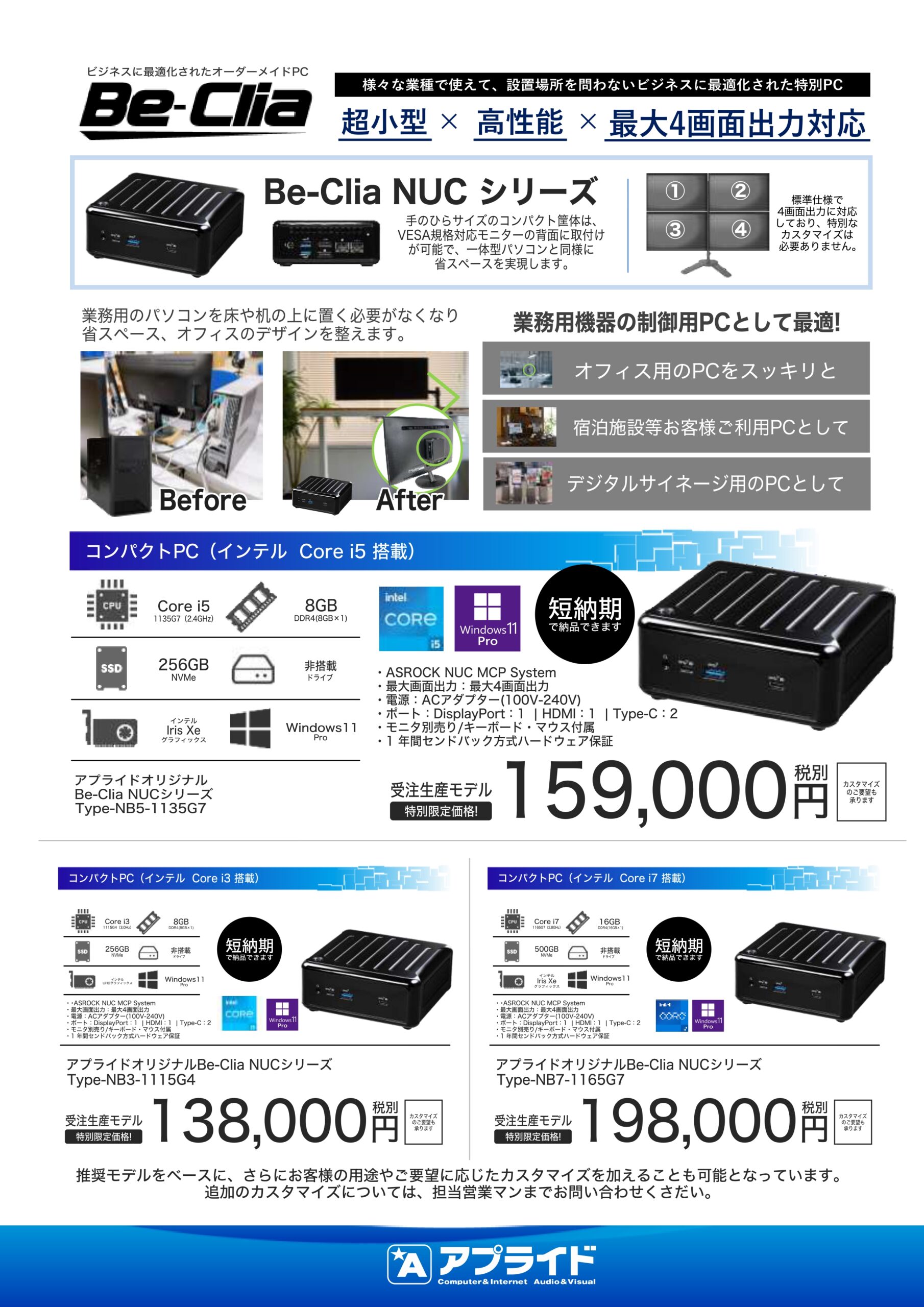 高性能で、最大4画面出力対応可能な「Be-Clia NUCシリーズ」や、高耐久で