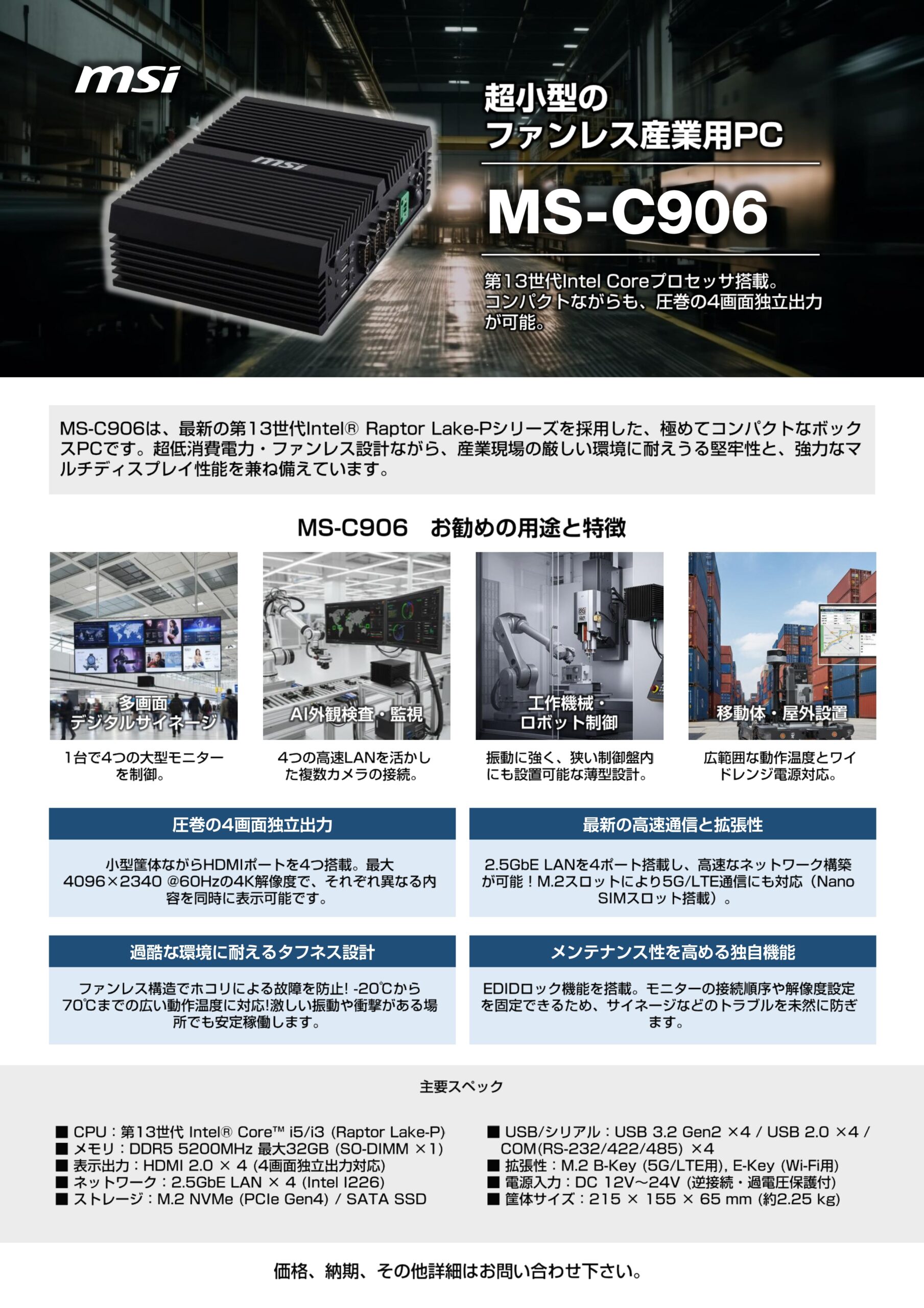■MS-C906は、最新の第13世代Intel® Raptor Lake-Pシリーズを採用した、極めてコンパクトなボックスPCです。超低消費電力・ファンレス設計ながら、産業現場の厳しい環境に耐えうる堅牢性と、強力なマルチディスプレイ性能を兼ね備えています。