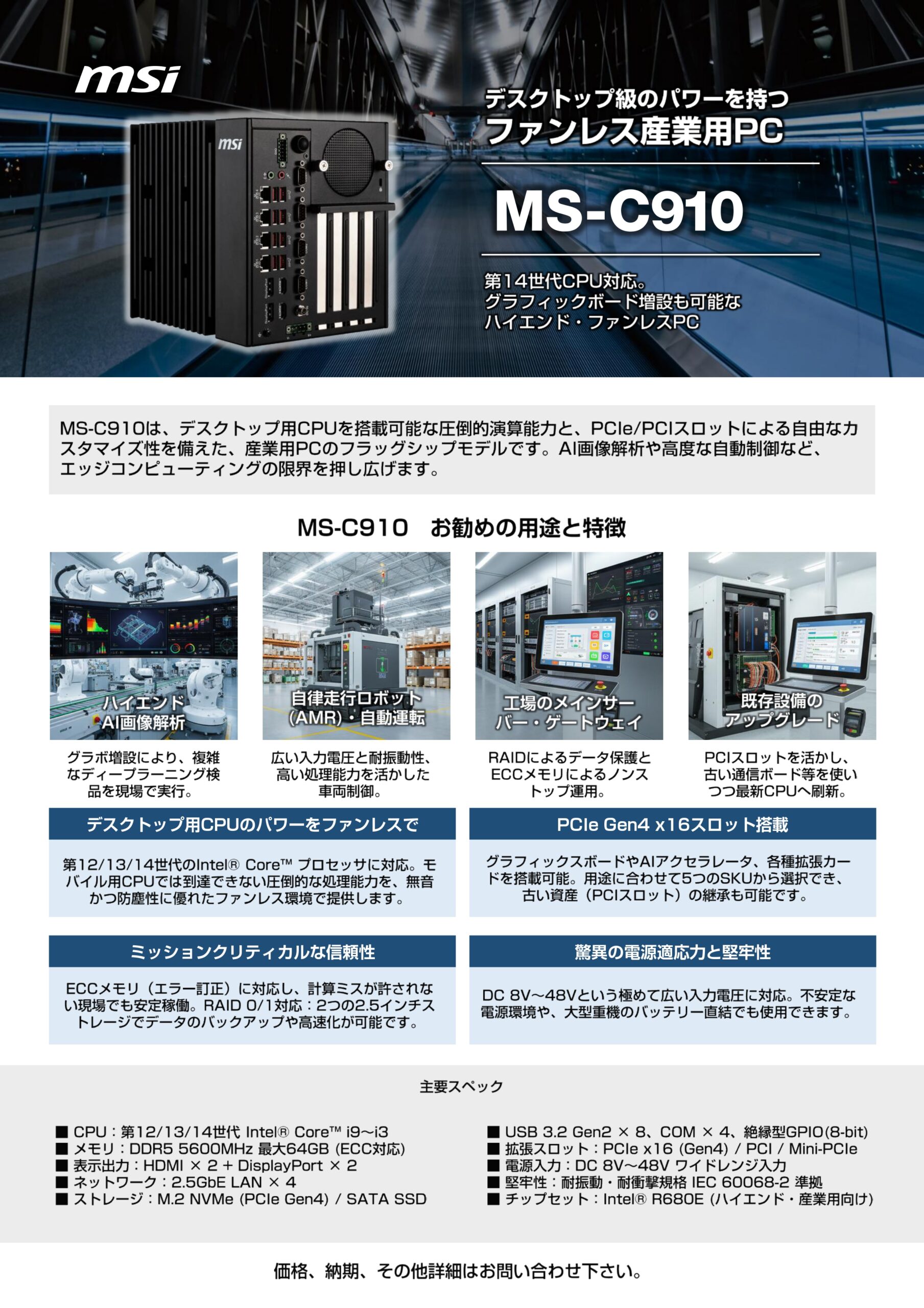 MSI(Micro-Star International)の産業用PC(IPC)ラインナップであるMS-C906、MS-C910、およびMS-1A71は、堅牢性、信頼性、高パフォーマンスを重視して設計された製品です。主にスマートファクトリー、エッジAI、公共・交通インフラなどの産業用途で採用されています。