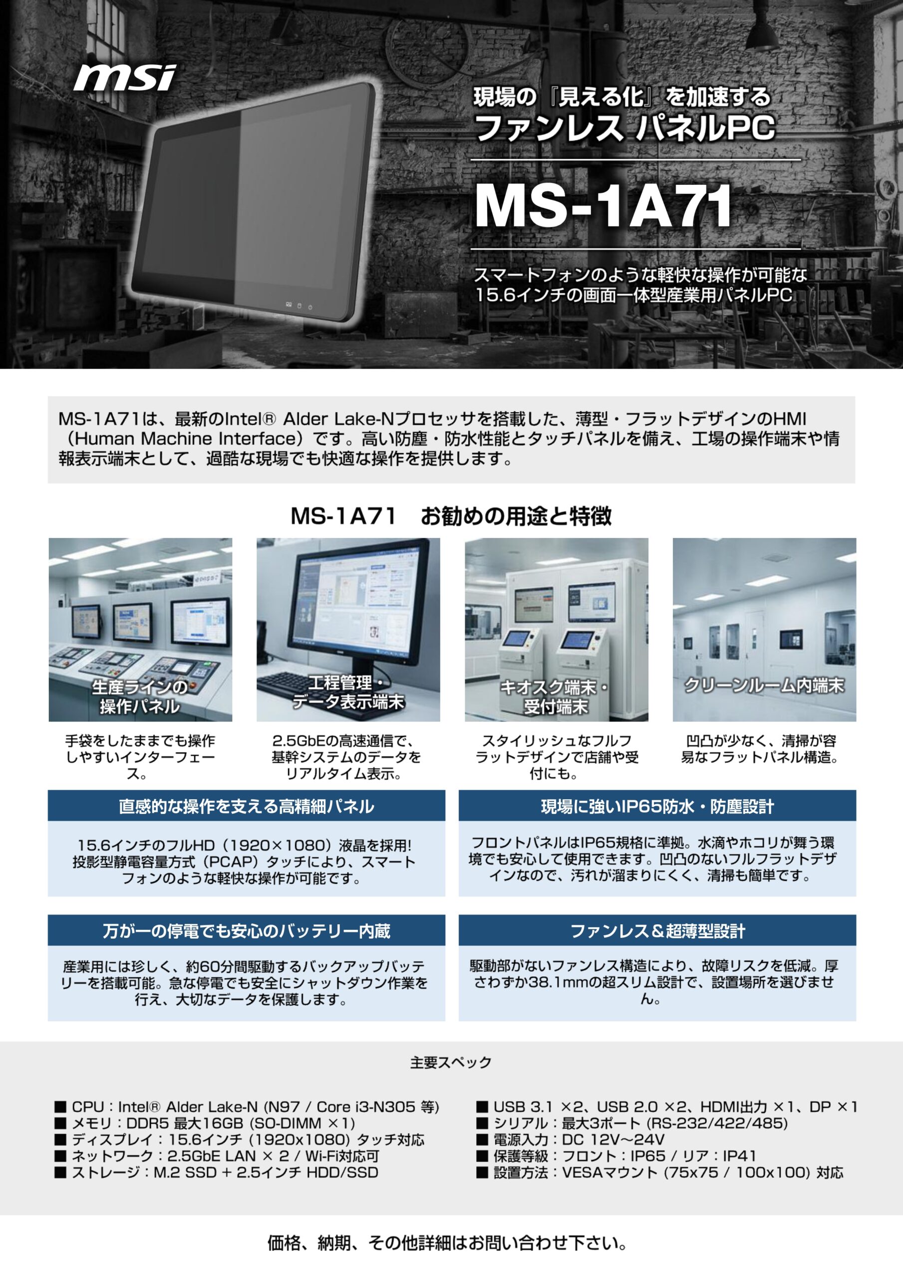 ■MS-1A71は、最新のIntel® Alder Lake-Nプロセッサを搭載した、薄型・フラットデザインのHMI(Human Machine Interface)です。高い防塵・防水性能とタッチパネルを備え、工場の操作端末や情報表示端末として、過酷な現場でも快適な操作を提供します。