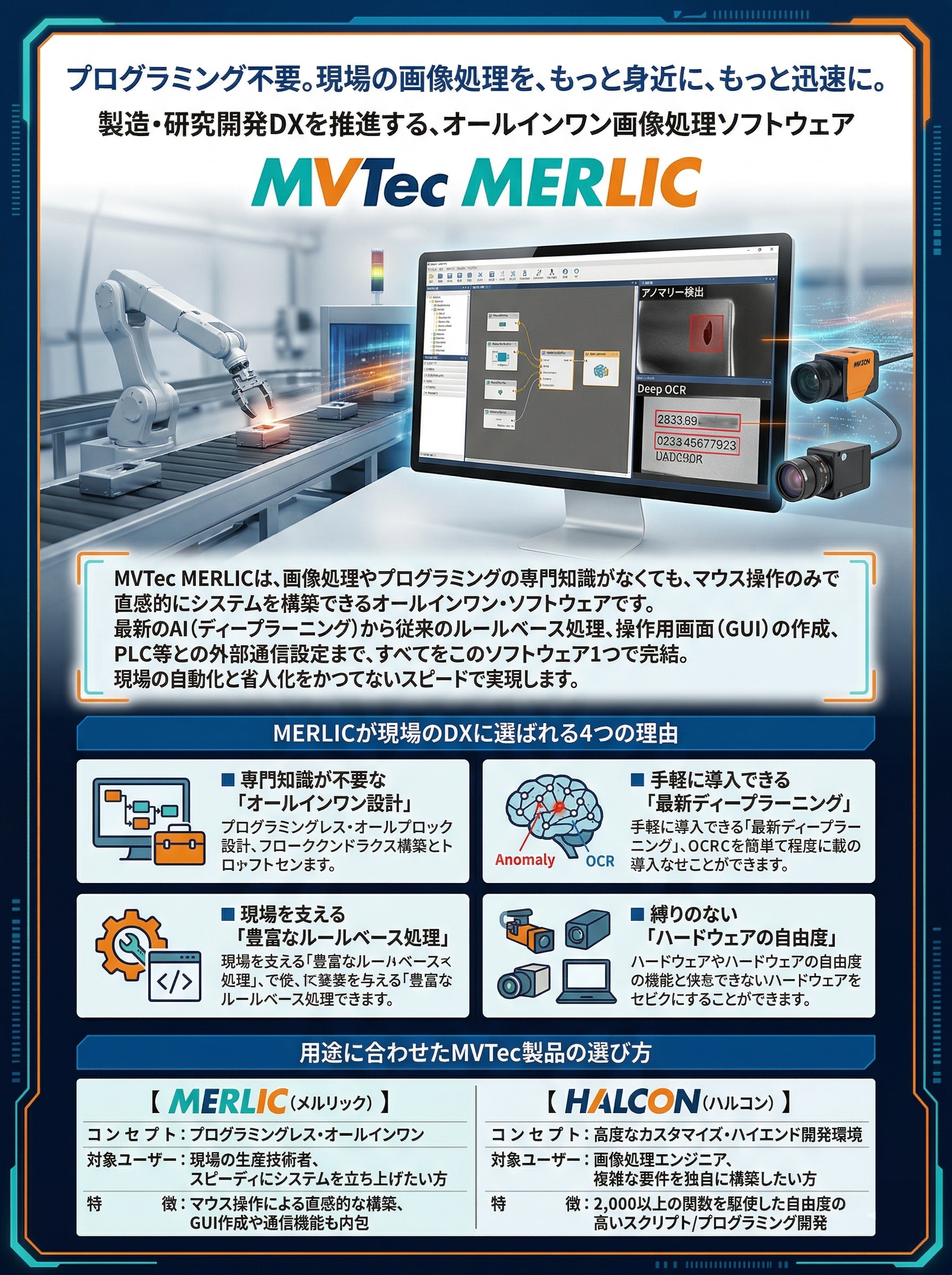 同社の「HALCON」が、数千の関数を組み合わせて高度なカスタマイズを行う「プログラミング/スクリプトベースの開発向け」であるのに対し、「MERLIC」は「現場での使いやすさと導入の迅速さ(プログラミングレス)」に特化しています。