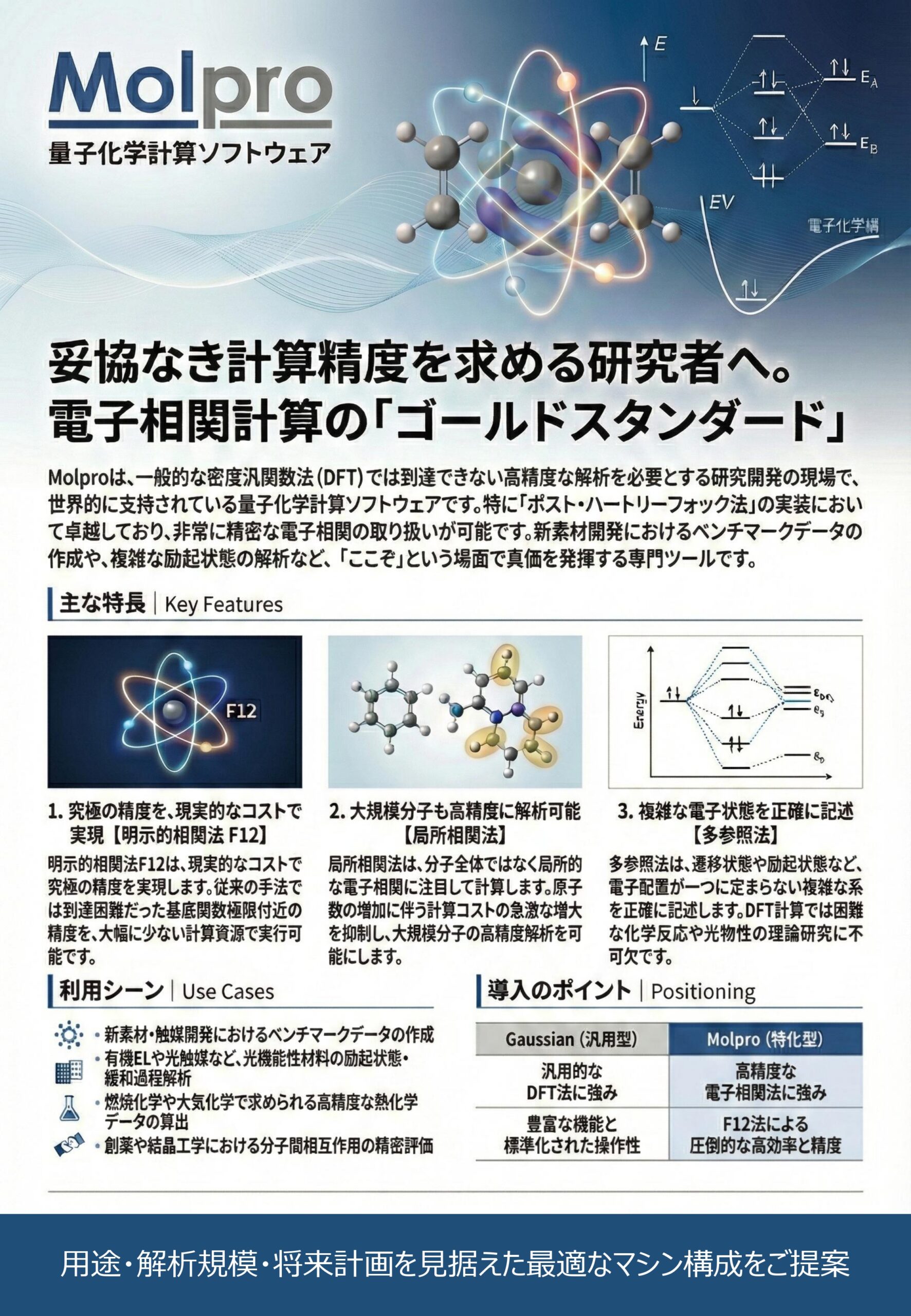 Molproは、量子化学計算の分野において、**「最高峰の精度」と「電子相関の効率的な計算」**に特化したソフトウェアとして広く知られています。特に、一般的な密度汎関数法(DFT)では扱いきれない高精度な計算や、複雑な電子状態(励起状態など)の解析において「ゴールドスタンダード(基準)」として利用されることが多い製品です。