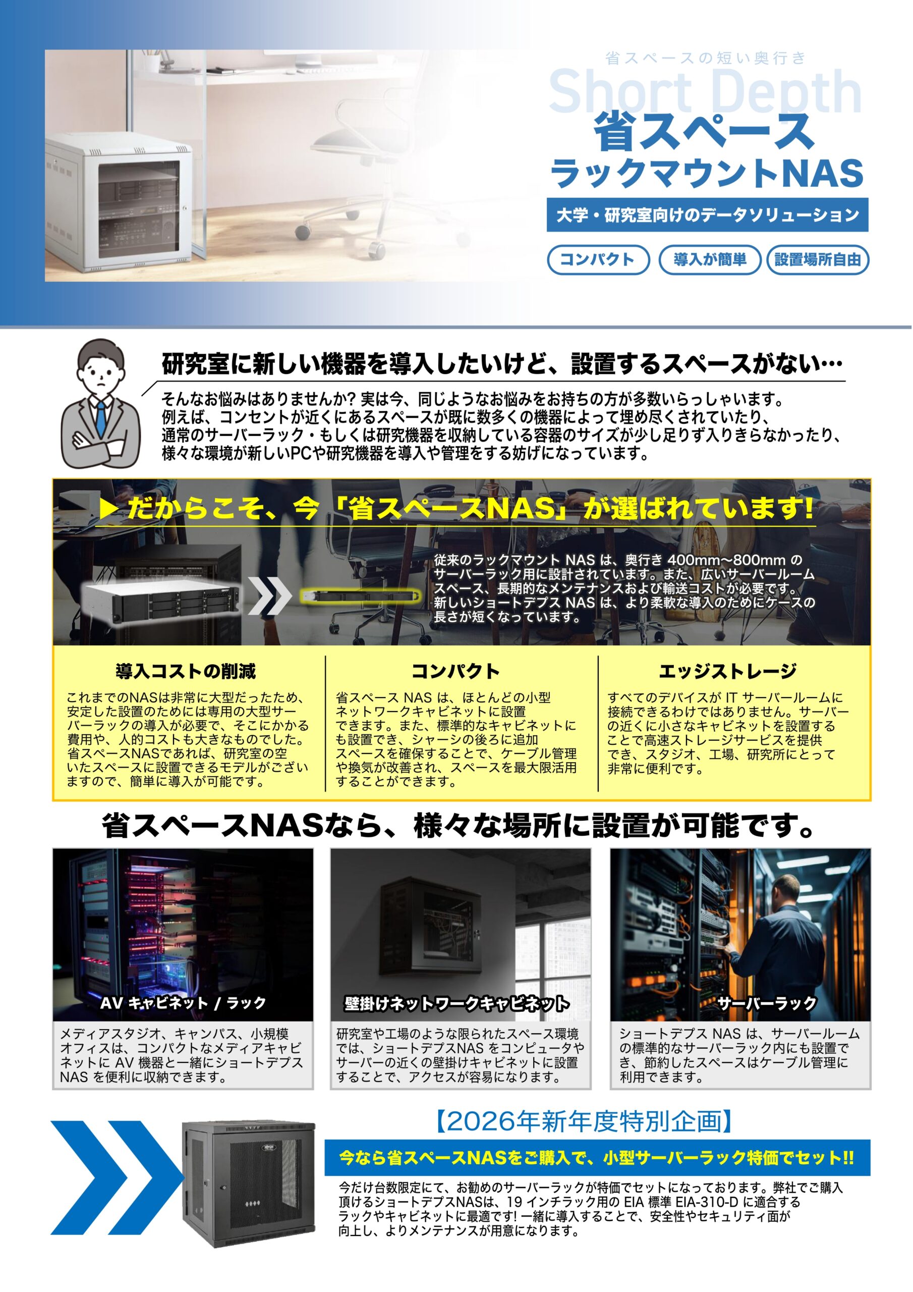 弊社でご購入頂けるショートデプスNASは、19 インチラック用の EIA 標準 EIA-310-D に適合するラックやキャビネットに最適です!